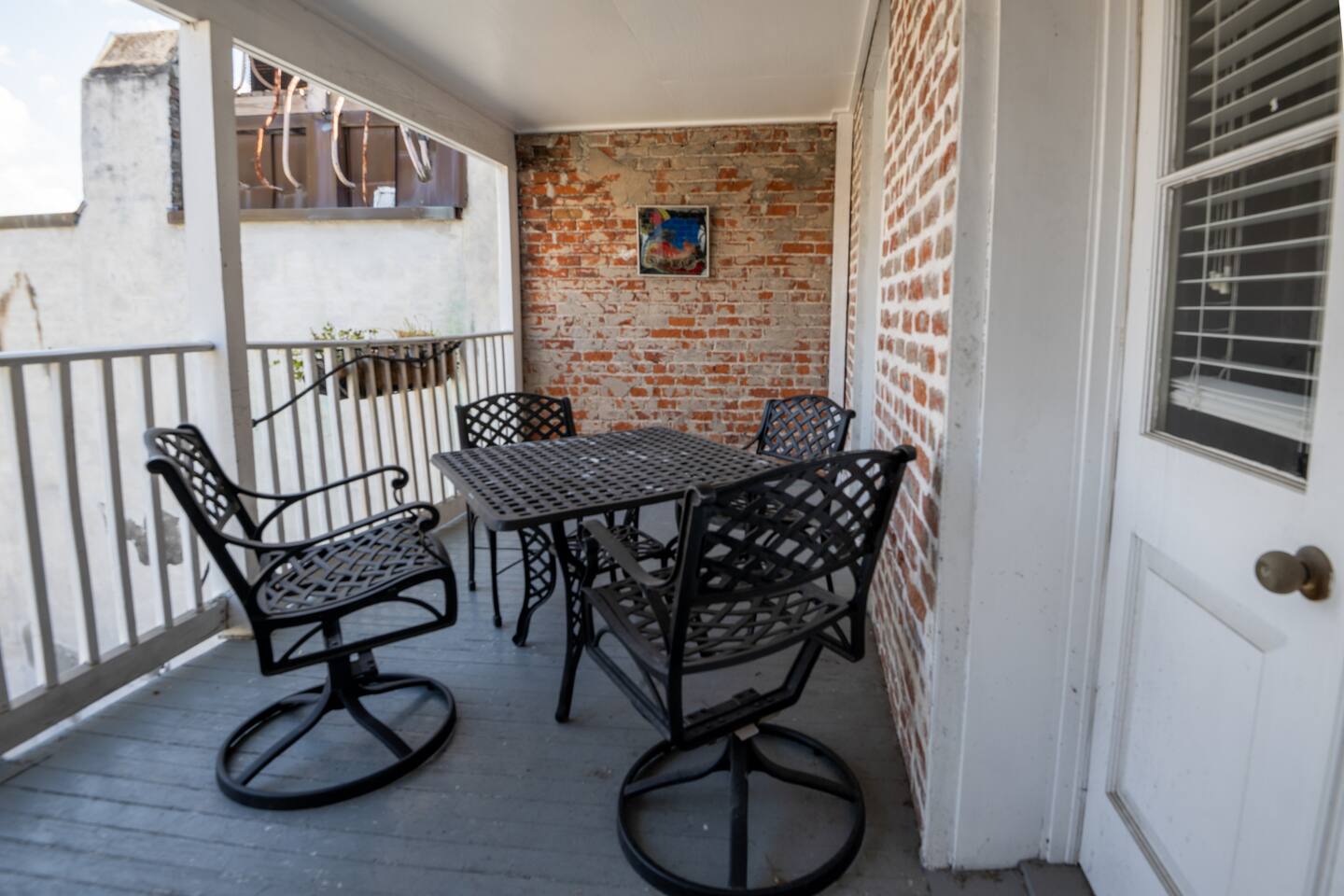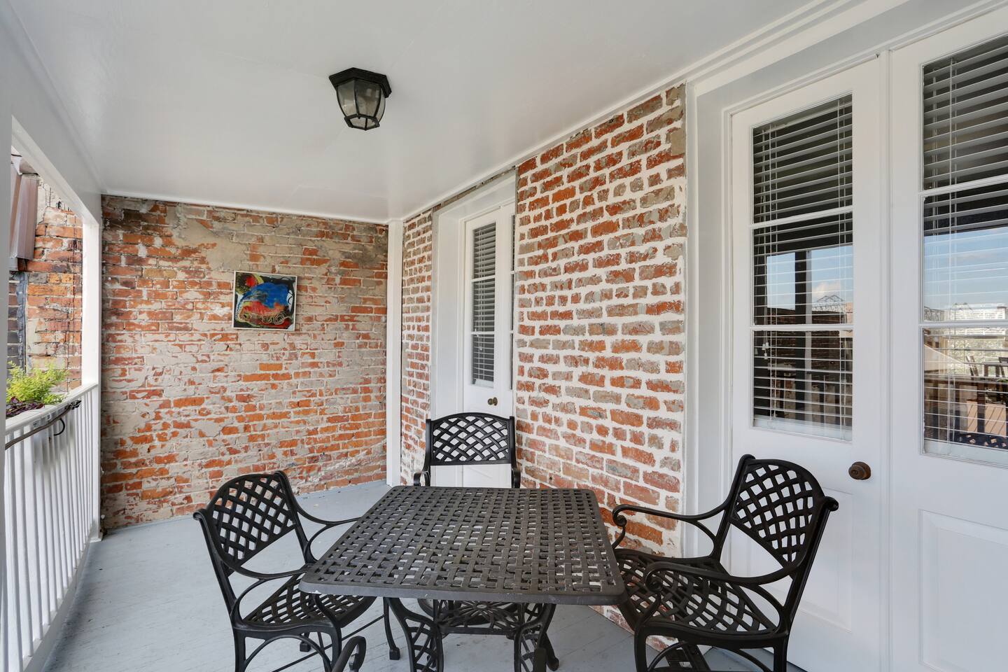 Designed for both comfort and style, this spacious unit accommodates up to 6 guests with: • Three elegant bedrooms, each with its own private bathroom. • Open-concept living and dining area with thoughtful decor. • Fully stocked kitchen perfect for home-cooked meals. • Charming gallery balcony and outdoor patio for relaxing evenings. • Modern amenities balanced with 19th-century architectural details. The building itself reflects classic New Orleans style, a red-brick facade, green shutters, and wrought-iron balconies that embody the city’s timeless character.