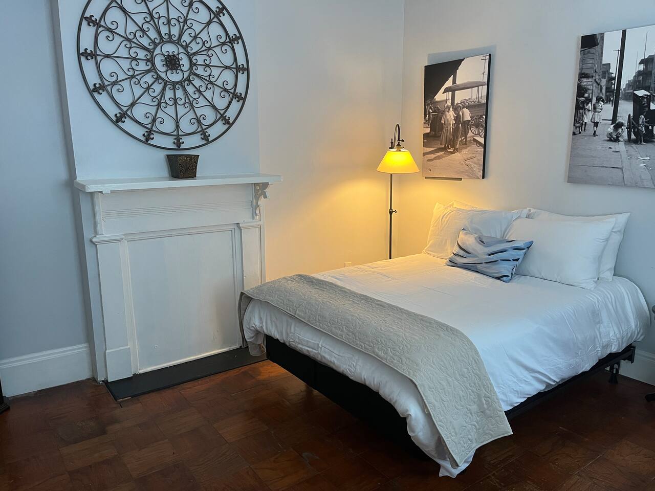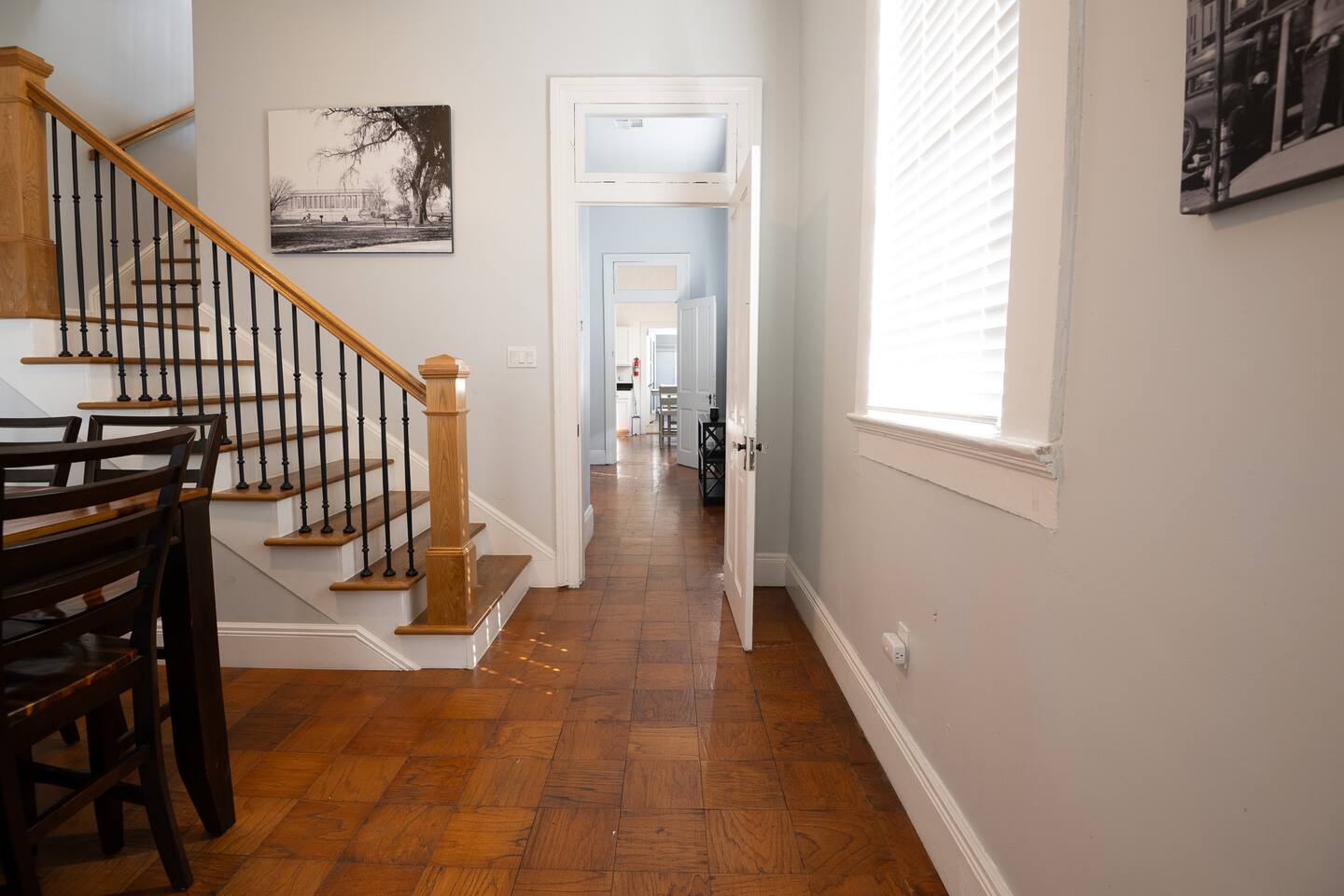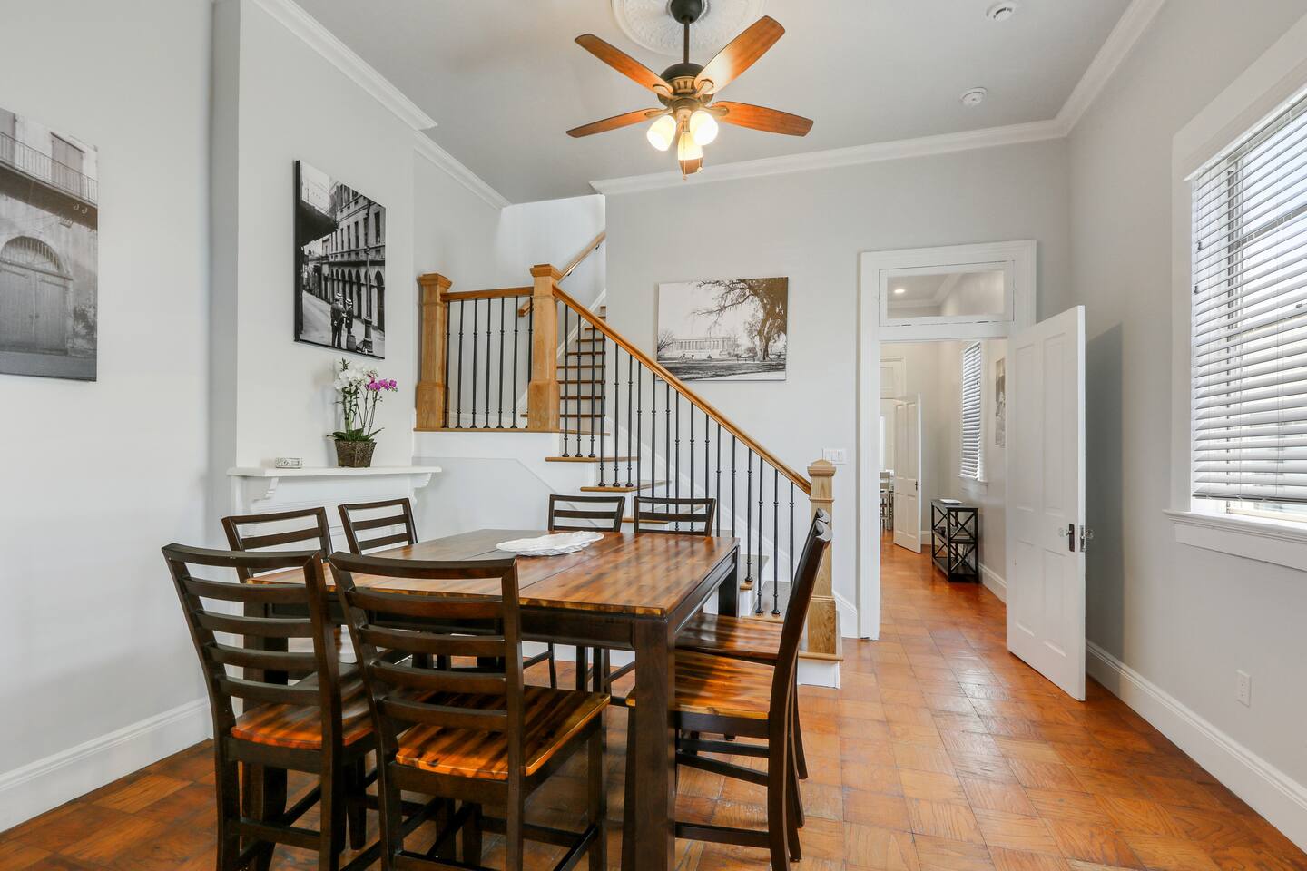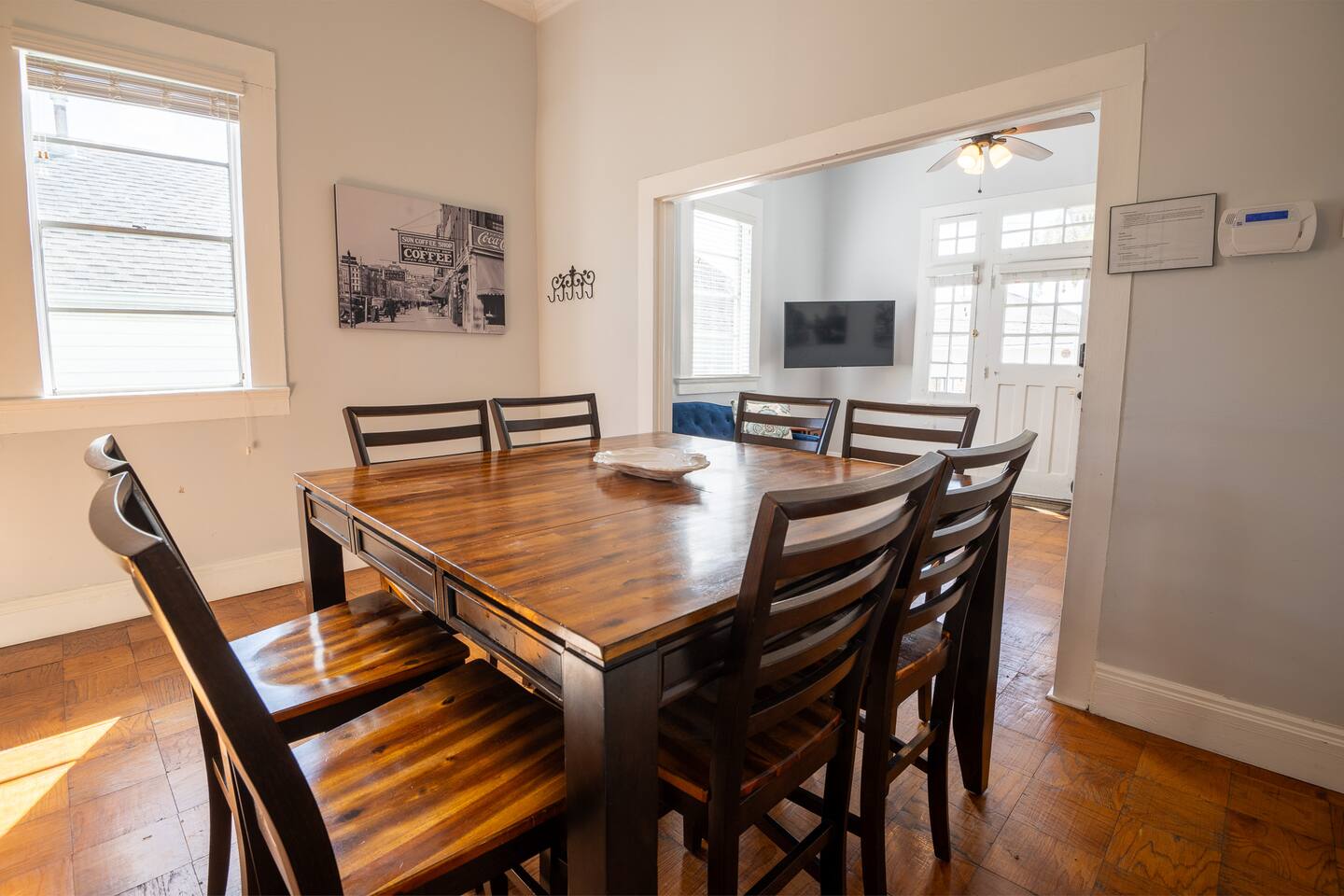 Immaculately renovated historic shotgun home in Mid-City with photographs documenting New Orleans' historical past. • 5 bedrooms, 2 bathrooms across two levels • Fully equipped kitchen and dining area • Spacious living room with historical décor • Over 3,000 sq. ft. of space for your group
