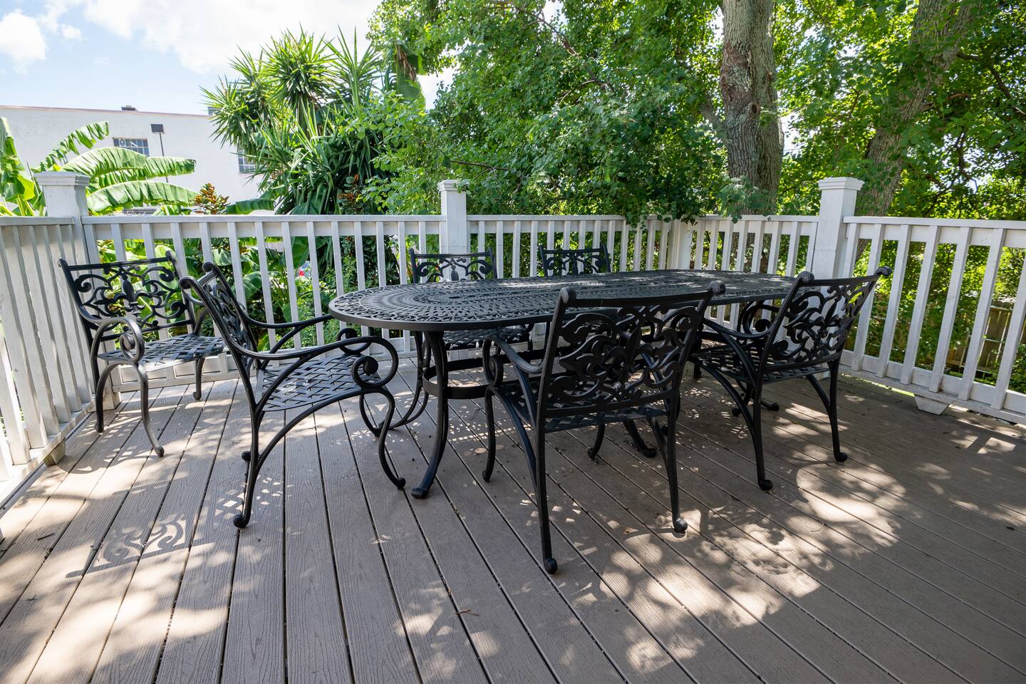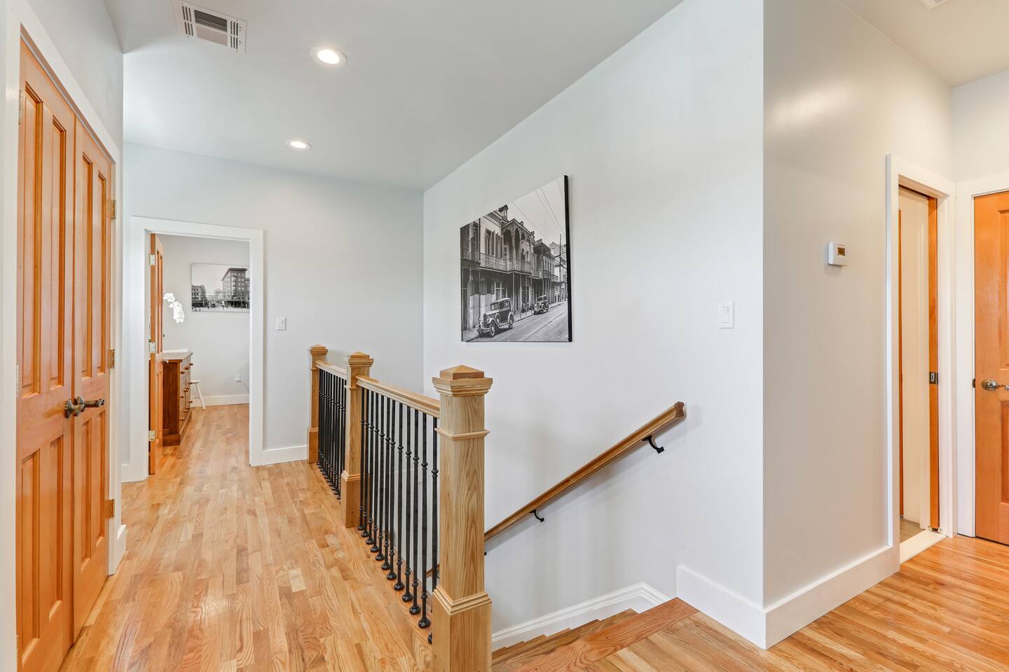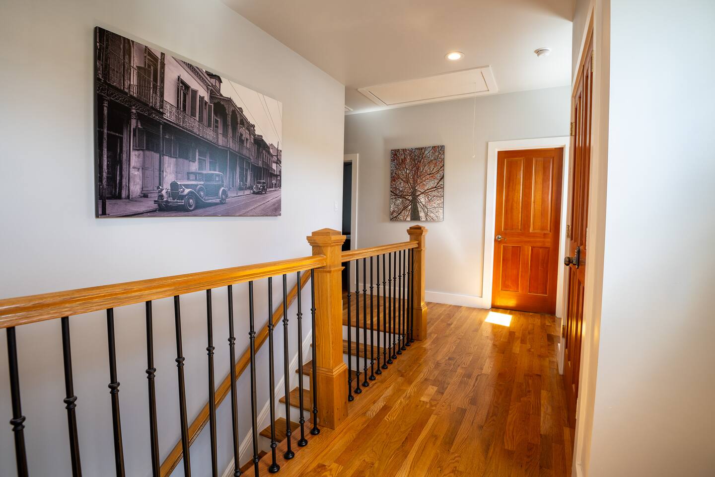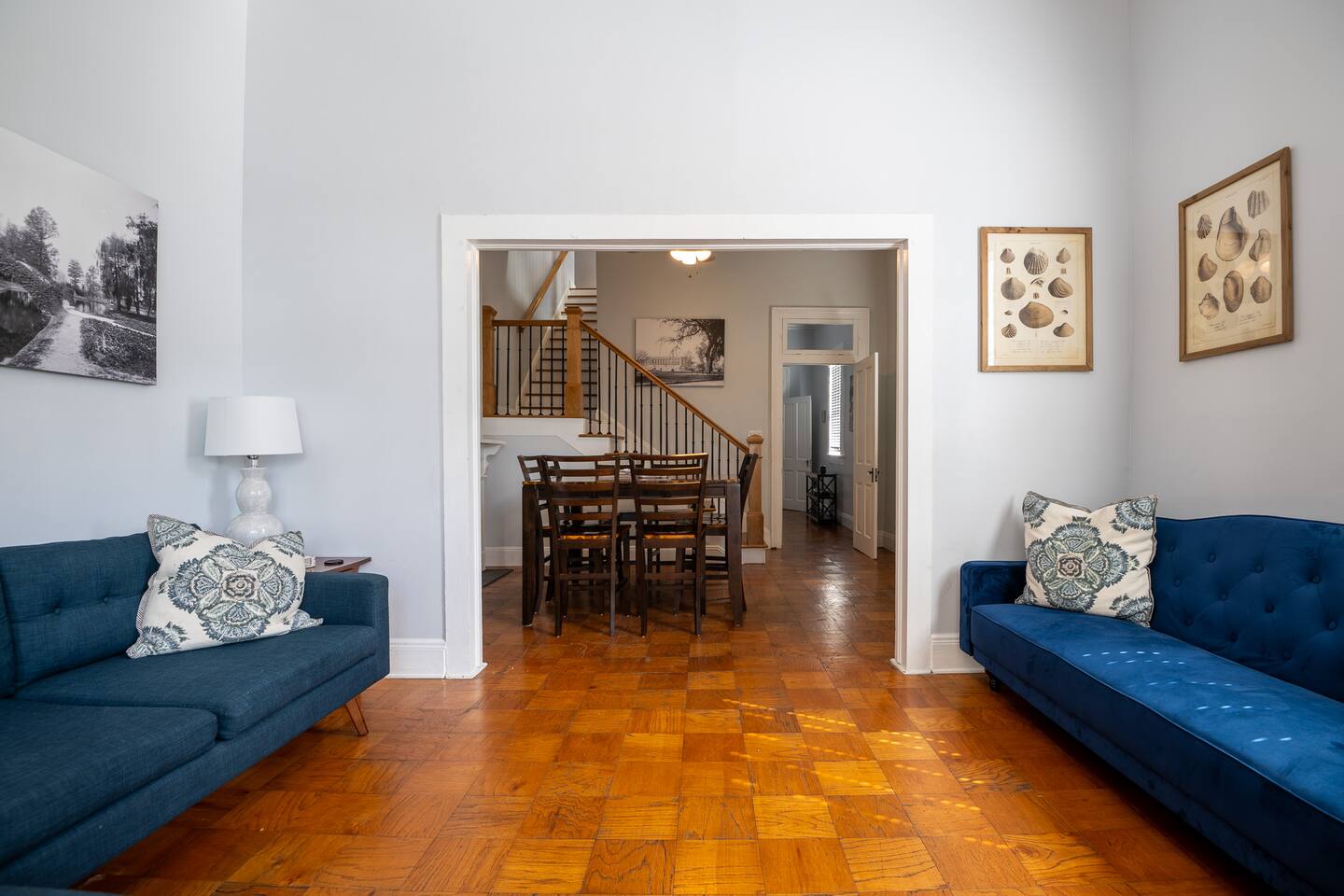 Immaculately renovated historic shotgun home in Mid-City with photographs documenting New Orleans' historical past. • 5 bedrooms, 2 bathrooms across two levels • Fully equipped kitchen and dining area • Spacious living room with historical décor • Over 3,000 sq. ft. of space for your group