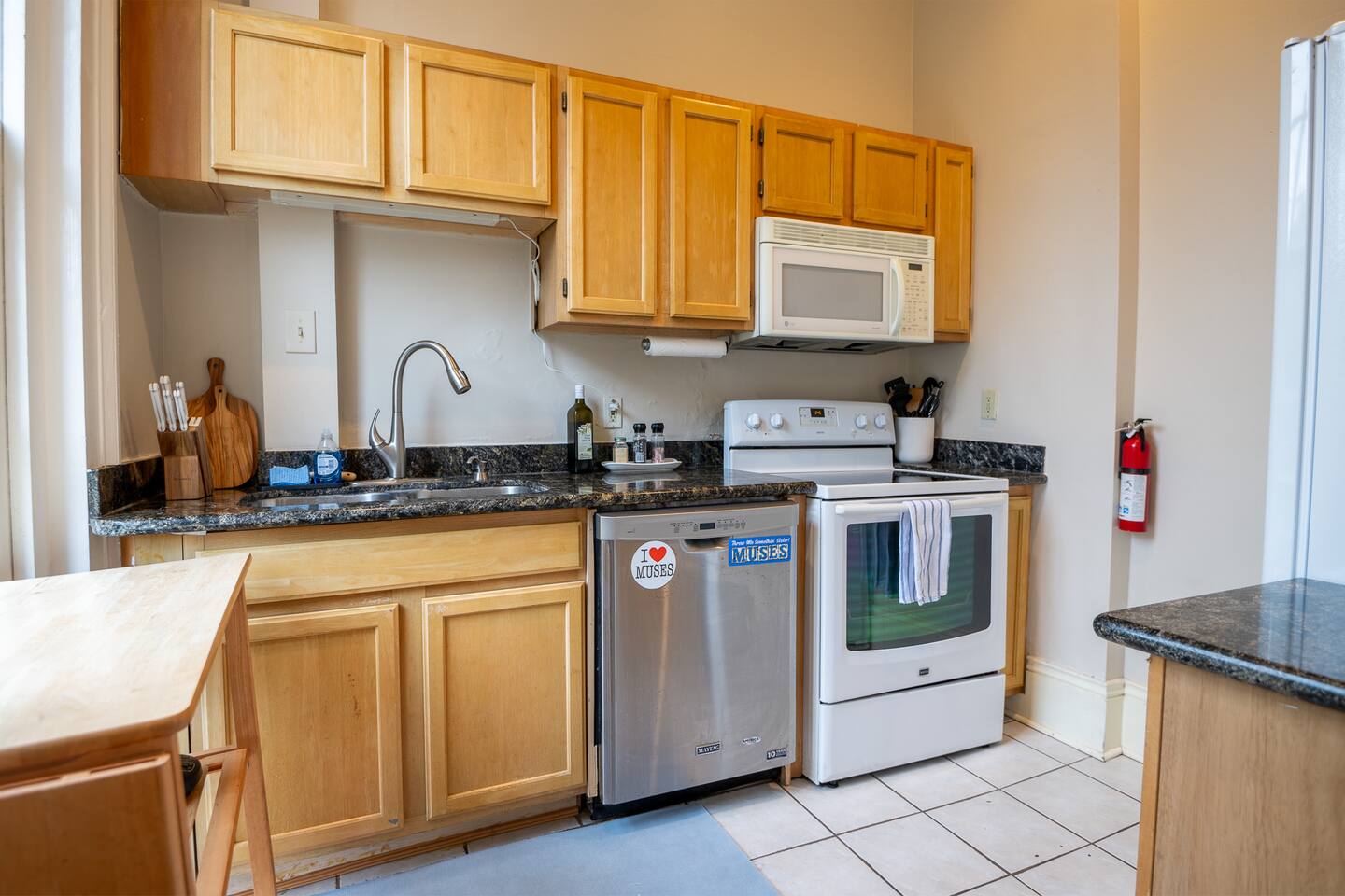 Guests have exclusive access to the entire apartment, including the private rear balcony (pictured) with courtyard views. Parking for one vehicle is available in the lot behind the building for your convenience.